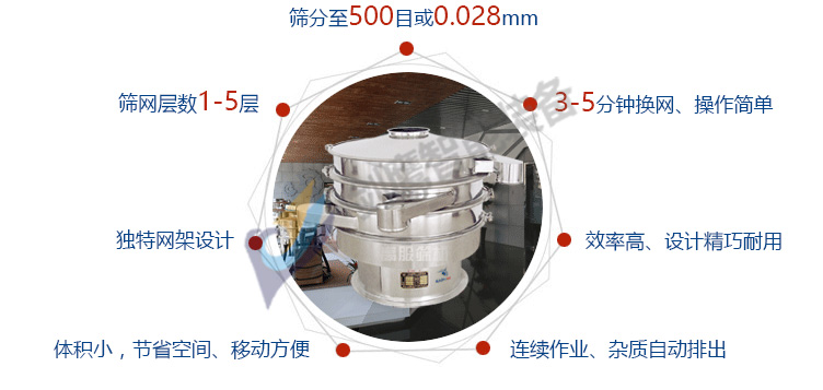 特点:任何颗粒、粉末、粘液一定范围内均可筛选。筛分细至500目或0.028mm, 过滤小可至5微米。分级筛选,可筛一至五层筛网,能同时进行二至六个等级的分选或过滤。效率高、设计精巧耐用,换网容易、操作简单、清洗方便。三元旋振筛杂质、粗料自动排出,可以连续作业。独特网架设计,筛网使用时间长久,换网快,只需3—5分钟。体积小,节省空间,移动方便。
